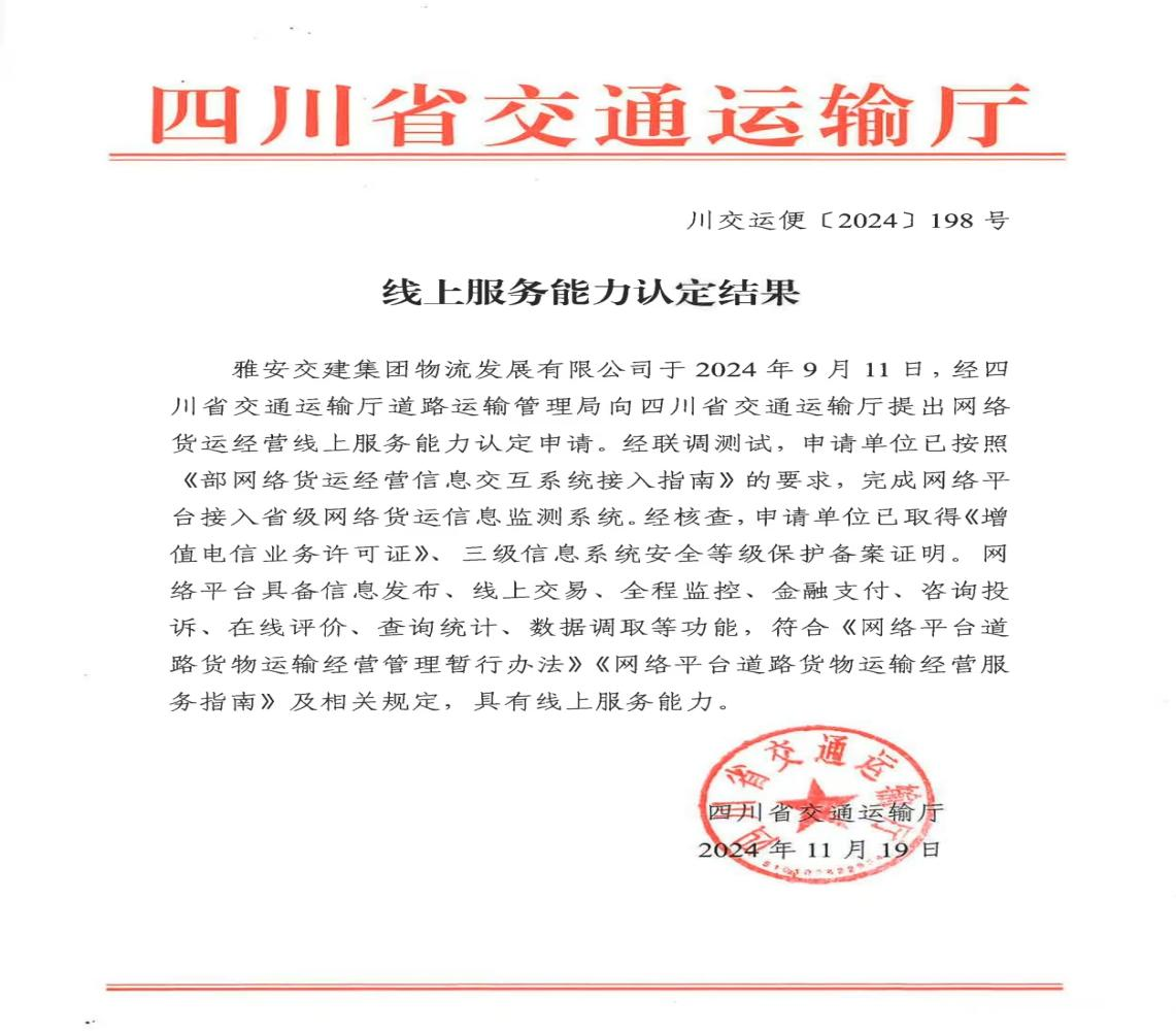 近日,《四川省交通運(yùn)輸廳線上服務(wù)能力認(rèn)定結(jié)果》發(fā)布,雅安交建集團(tuán)物流發(fā)展有限公司正式取得網(wǎng)絡(luò)貨運(yùn)經(jīng)營(yíng)線上服務(wù)能力認(rèn)定,標(biāo)志著雅安首家國(guó)企網(wǎng)絡(luò)貨運(yùn)平臺(tái)即將面向市場(chǎng)運(yùn)營(yíng)。
