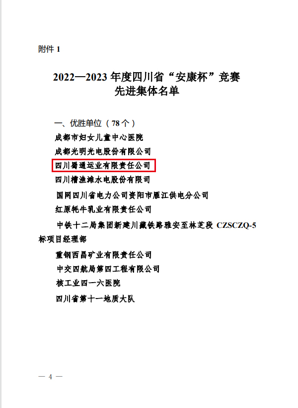 日前,省總工會、省應(yīng)急管理廳、省衛(wèi)健委聯(lián)合發(fā)文表揚(yáng)2022-2023年度四川省“安康杯”競賽先進(jìn)集體和先進(jìn)個(gè)人,蜀通公司被評為“優(yōu)勝單位”。
