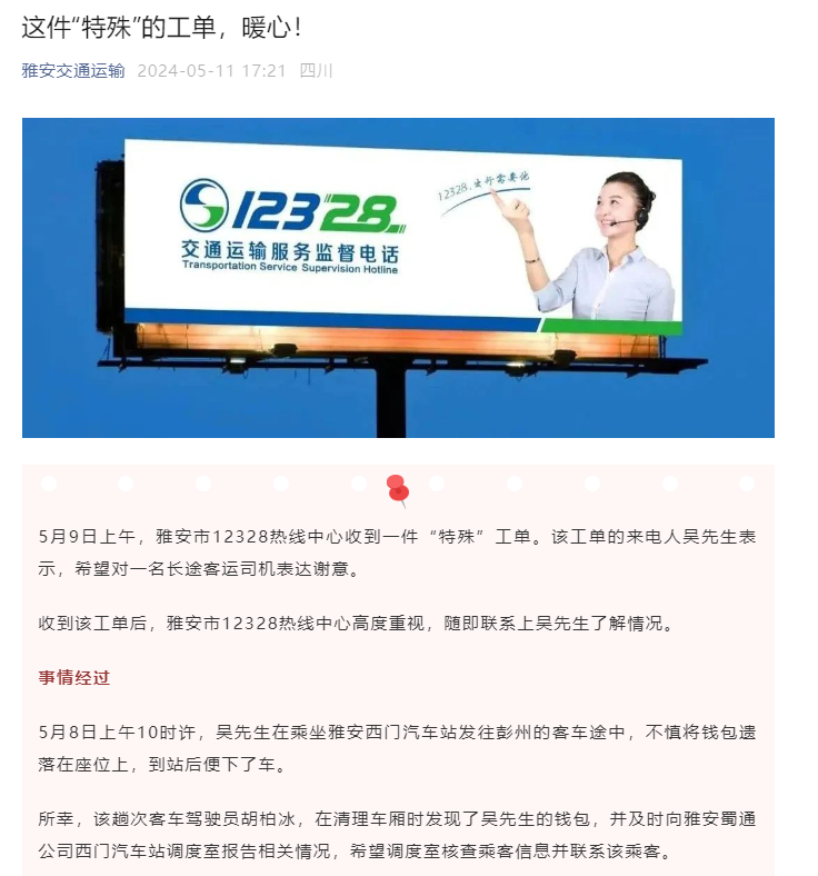 5月8日上午,乘客吳先生在乘坐蜀通公司客車時(shí),不慎將錢包遺落在座位上。司機(jī)胡柏冰在清理車廂衛(wèi)生時(shí)發(fā)現(xiàn)了這個(gè)錢包,他立即向蜀通公司西門車站調(diào)度室匯報(bào),并在調(diào)度室的協(xié)助下,吳先生成功取回了自己的錢包。雅安市12328熱線中心在接到吳先生的反饋后,對(duì)蜀通公司的服務(wù)和司機(jī)胡柏冰的善舉給予了高度評(píng)價(jià),并通過(guò)雅安交通局公眾號(hào)進(jìn)行了宣傳表?yè)P(yáng)。