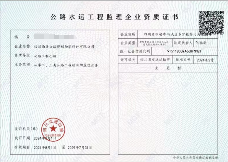 近日,經(jīng)四川省交通運輸廳批準(zhǔn),雅安交建集團(tuán)勘察設(shè)計公司成功取得公路工程監(jiān)理乙級資質(zhì),該資質(zhì)的成功獲批,標(biāo)志著我公司業(yè)務(wù)邁向新領(lǐng)域。