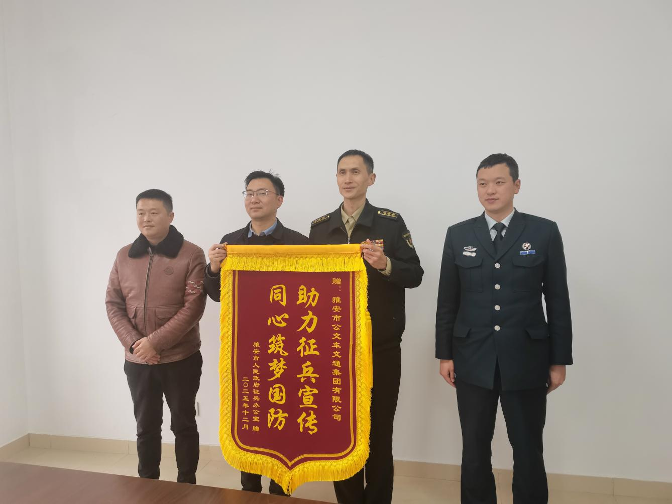 近日,雅安市人民政府征兵辦公室副主任、雅安軍分區(qū)動(dòng)員處上校處長(zhǎng)賈子龍一行專程赴公交集團(tuán)贈(zèng)送錦旗,感謝公交集團(tuán)在2025年度征兵公益宣傳工作中作出的貢獻(xiàn),公司董事長(zhǎng)李強(qiáng)軍接待并開(kāi)展座談。