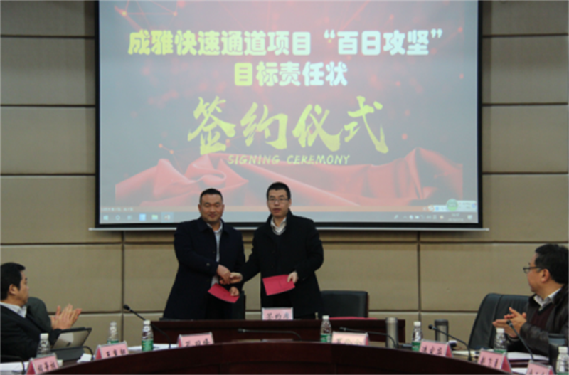 會上,項目公司介紹了項目建設(shè)情況;市交通運輸局安排布置了“百日攻堅”活動;中建三局、六局、參建單位分別發(fā)言,建設(shè)單位分別與各標(biāo)段簽訂“百日攻堅”責(zé)任狀,會議在嚴(yán)肅又緊張的氛圍下進行。