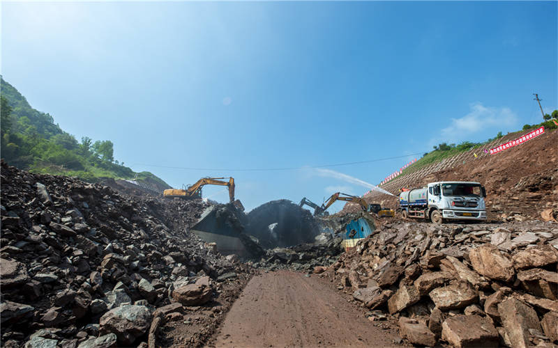 上午10點,金雞關(guān)隧道開挖現(xiàn)場,多臺大型破碎機和灑水除塵設(shè)備同時按下啟動鍵,建設(shè)的“沖鋒號”奏響。金雞關(guān)隧道開挖是整個項目取得突破性進展的標志,是路基鋪設(shè)和邊坡抗滑裝等施工開展的基礎(chǔ)。目前土方開挖已完成365萬方,邊坡施工已完成8級,項目整體推進有序,預(yù)計兩個月完成隧道部分開挖。