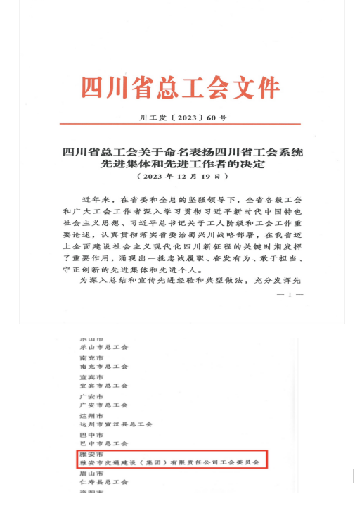 12月19日,四川省總工會將雅安市交通建設(集團)有限責任公司工會委員會命名表揚為“四川省工會系統(tǒng)先進集體”。
