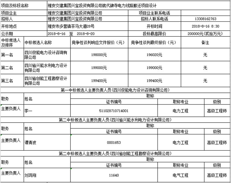 雅安交建集團(tuán)興寶投資有限公司就代碑寺電力線(xiàn)路搬遷項(xiàng)目設(shè)計(jì)競(jìng)爭(zhēng)性談判中標(biāo)候選人公示