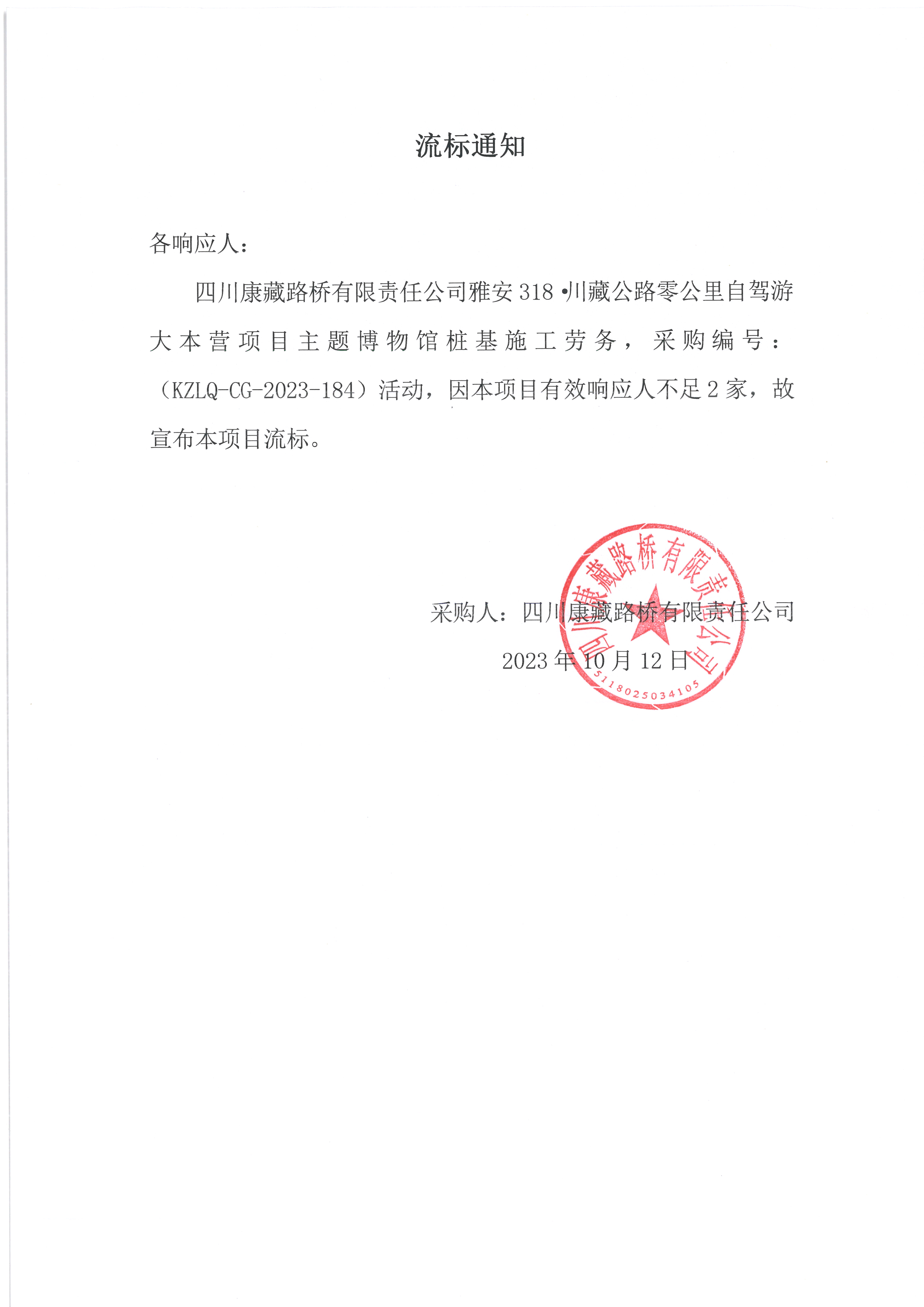 四川康藏路橋有限責(zé)任公司雅安318·川藏公路零公里自駕游大本營項(xiàng)目主題博物館樁基施工勞務(wù)流標(biāo)通知