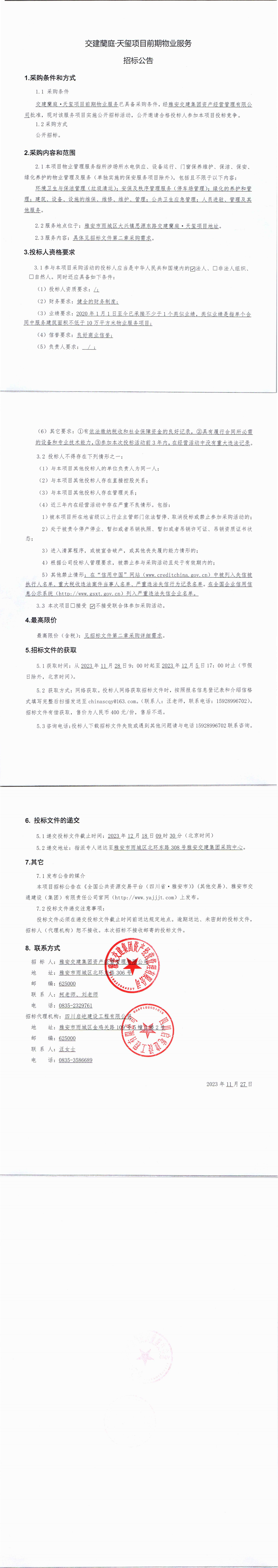雅安交建集團資產經營管理有限公司交建蘭庭·天璽項目前期物業(yè)服務招標公告