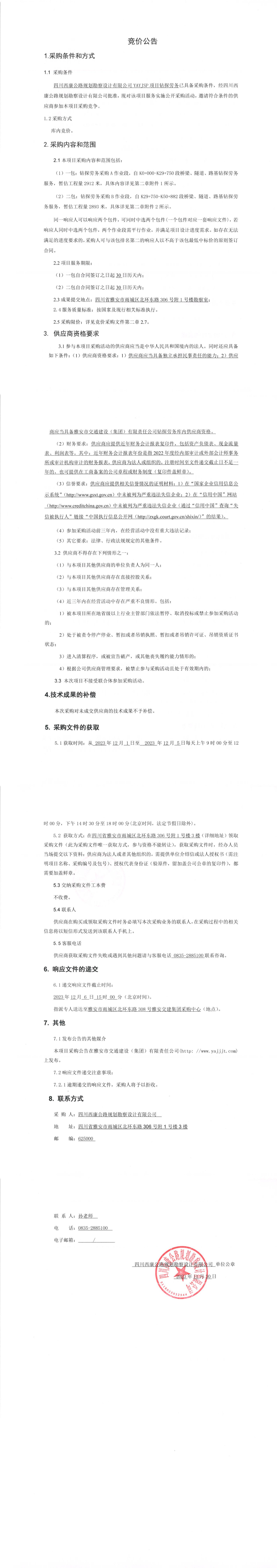 四川西康公路規(guī)劃勘察設(shè)計有限公司YAYJSP目鉆探勞務競價公告