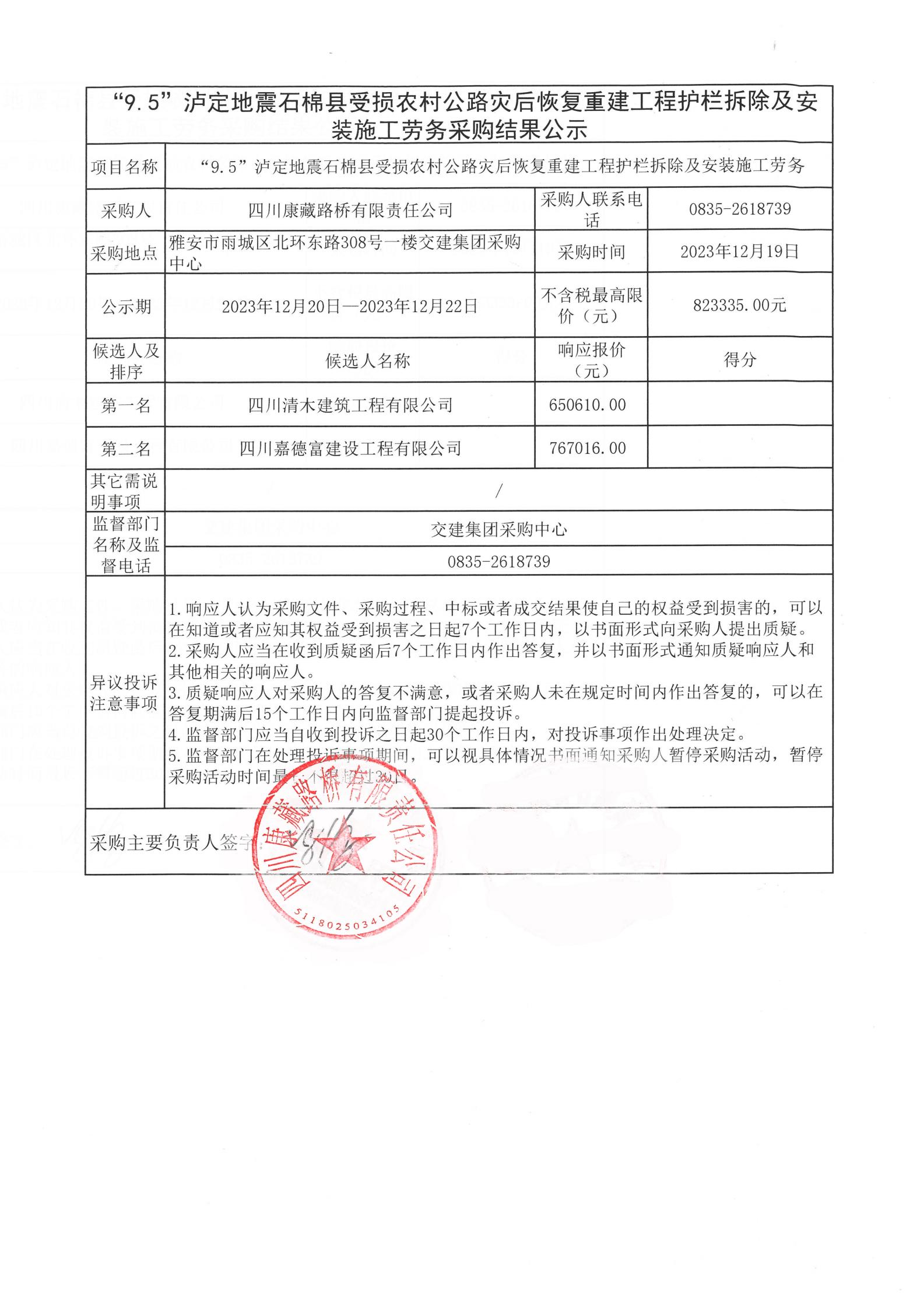 四川康藏路橋有限責任公司“9.5”瀘定地震石棉縣受損農(nóng)村公路災(zāi)后恢復(fù)重建工程護欄拆除及安裝施工勞務(wù)采購結(jié)果公示