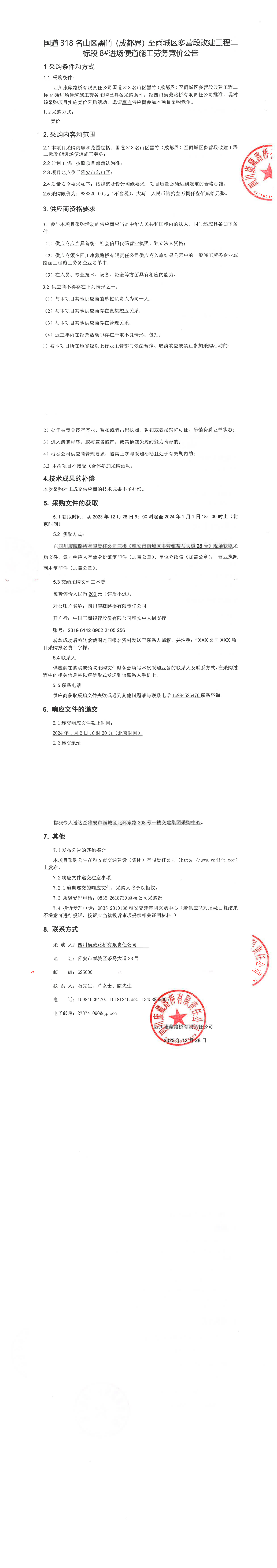 四川康藏路橋有限責任公司國道318名山區(qū)黑竹(成都界)至雨城區(qū)多營段改建工程二標段8#進場便道施工勞務競價公告