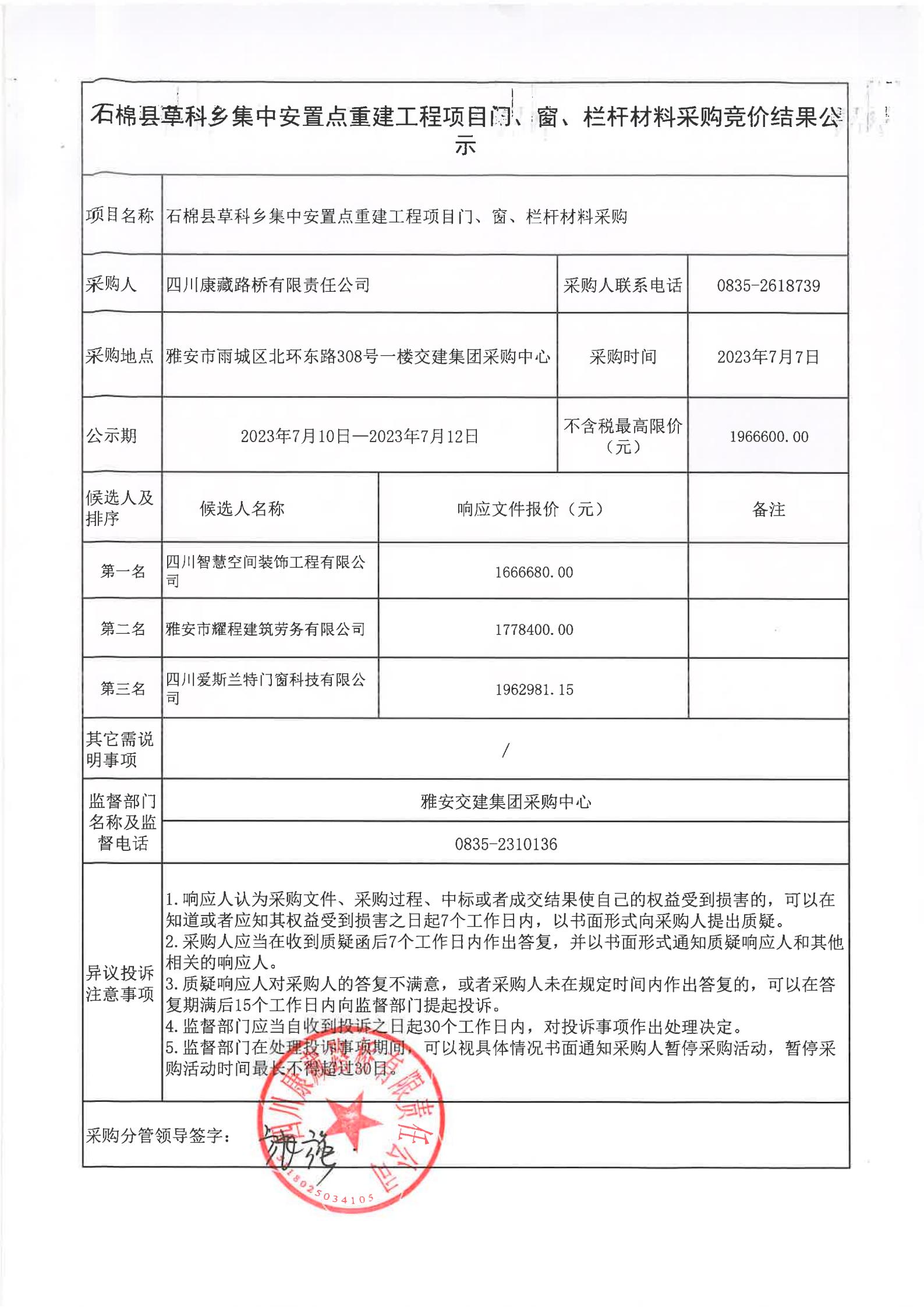 四川康藏路橋有限責任公司石棉草科鄉(xiāng)集中安置點重建工程項目門、窗、欄桿材料采購競價結果公示