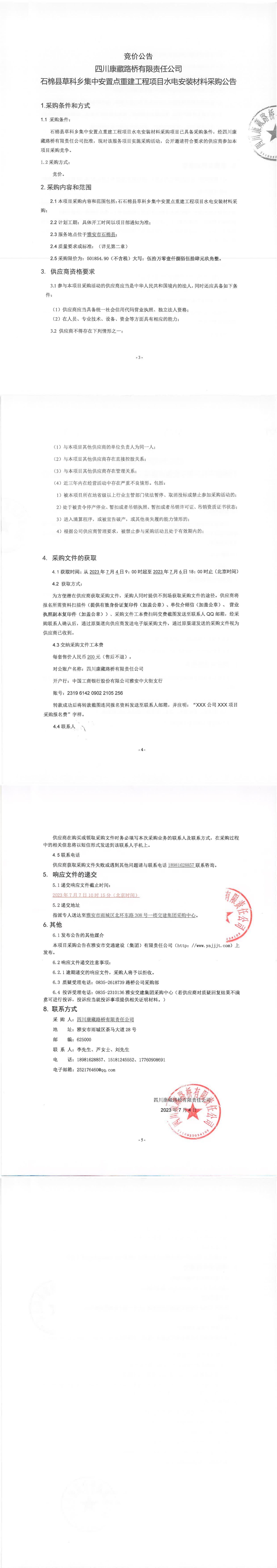 四川康藏路橋有限責(zé)任公司石棉縣草科鄉(xiāng)集中安置點重建工程項目水電安裝材料采購公告