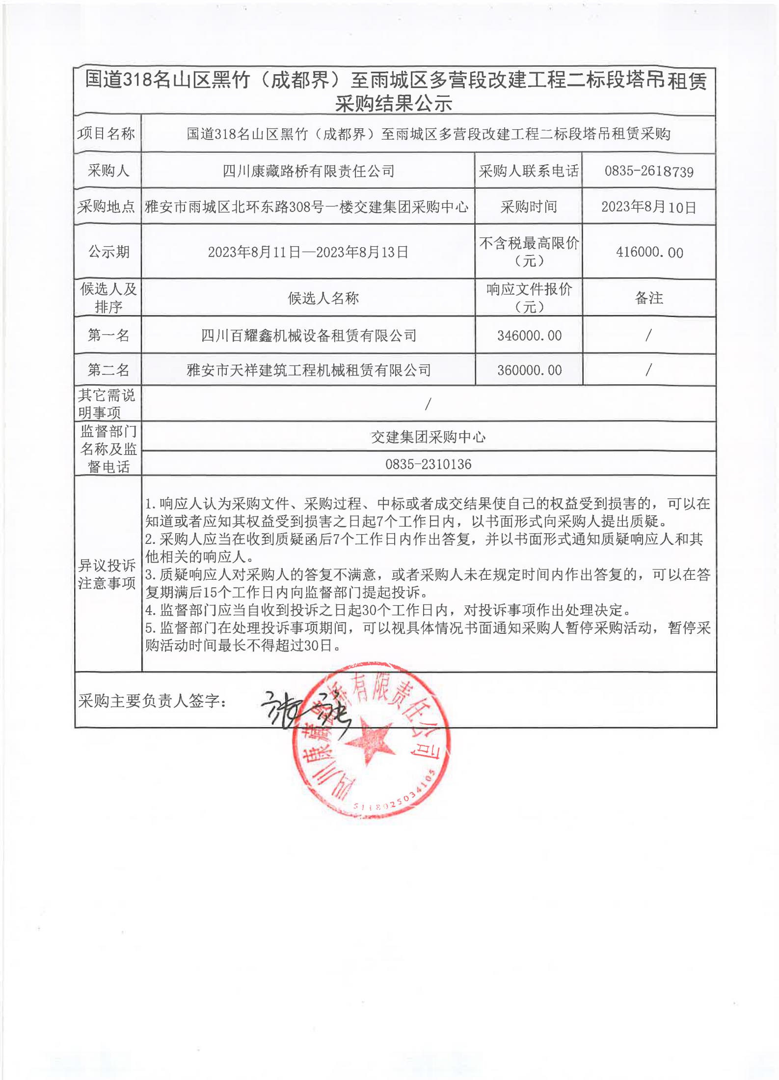 四川康藏路橋有限責(zé)任公司國(guó)道318名山區(qū)黑竹(成都界)至雨城區(qū)多營(yíng)段改建工程二標(biāo)段塔吊租賃采購(gòu)結(jié)果公示