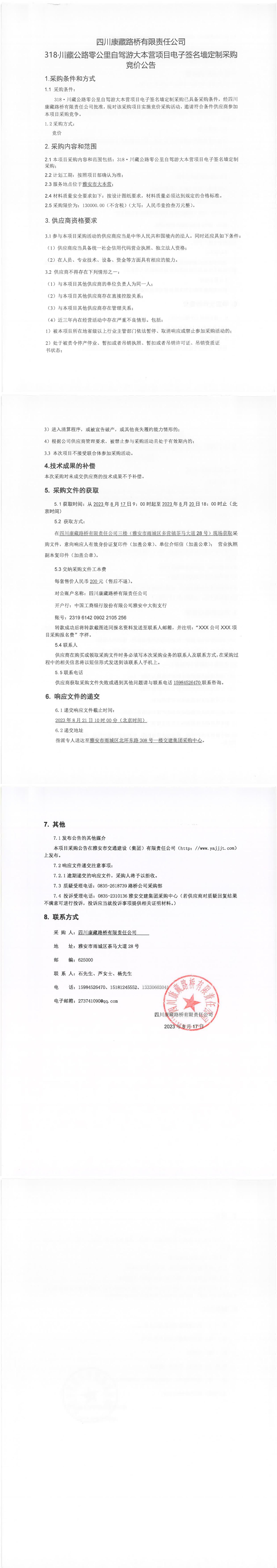 四川康藏路橋有限責(zé)任公司318·川藏公路零公里自駕游大本營(yíng)項(xiàng)目電子簽名墻定制采購(gòu)競(jìng)價(jià)公告