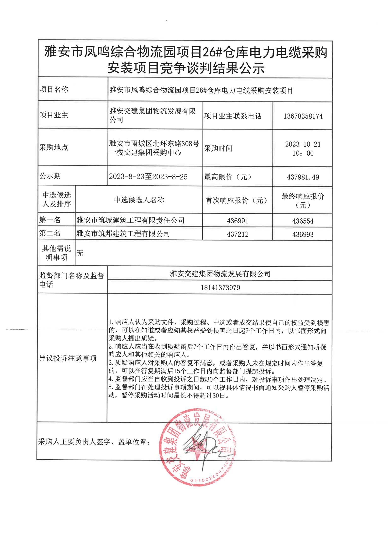 雅安交建集團物流發(fā)展有限公司雅安市鳳鳴綜合物流園項目26#倉庫電力電纜采購安裝項目競爭談判結(jié)果公示