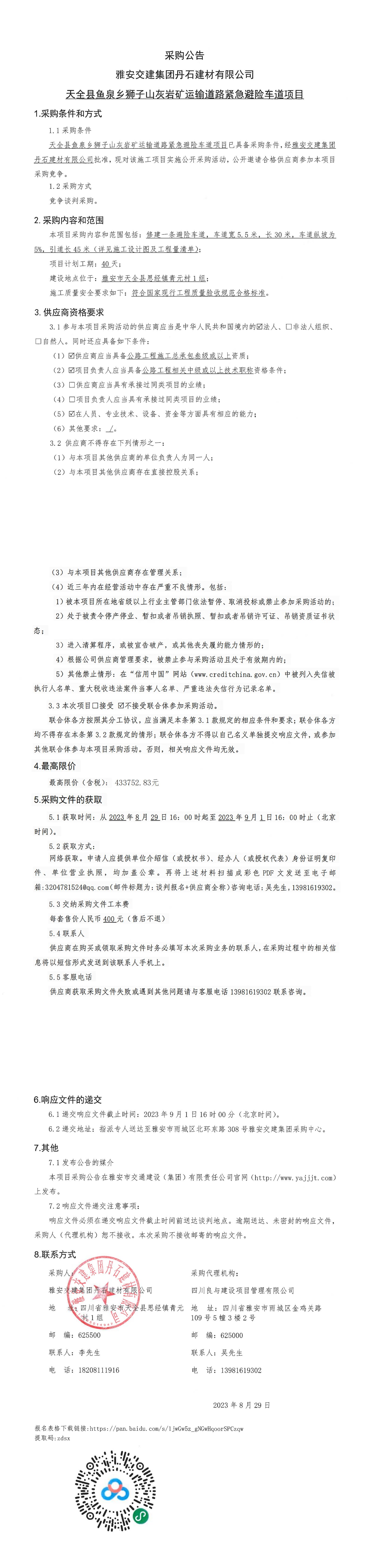 雅安交建集團丹石建材有限公司天全縣魚泉鄉(xiāng)獅子山灰?guī)r礦運輸?shù)缆肪o急避險車道項目采購公告