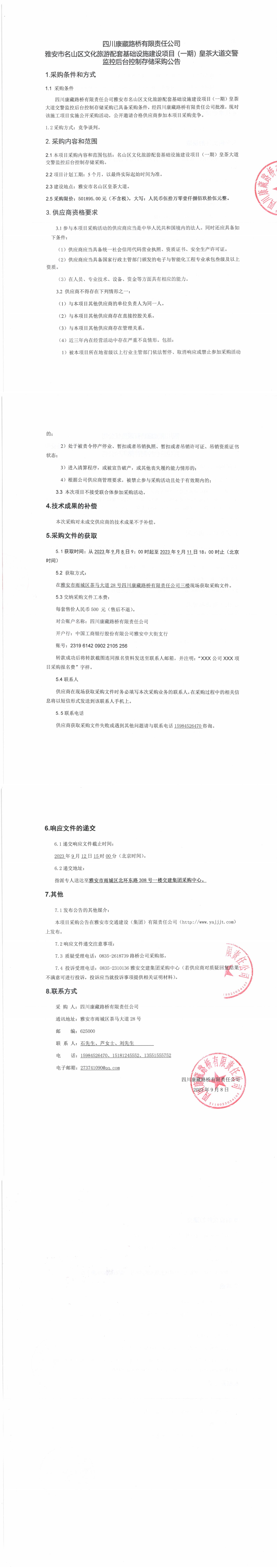 四川康藏路橋有限責(zé)任公司雅安市名山區(qū)文化旅游配套基礎(chǔ)設(shè)施建設(shè)項(xiàng)目(一期)皇茶大道交警監(jiān)控后臺(tái)控制存儲(chǔ)采購(gòu)公告