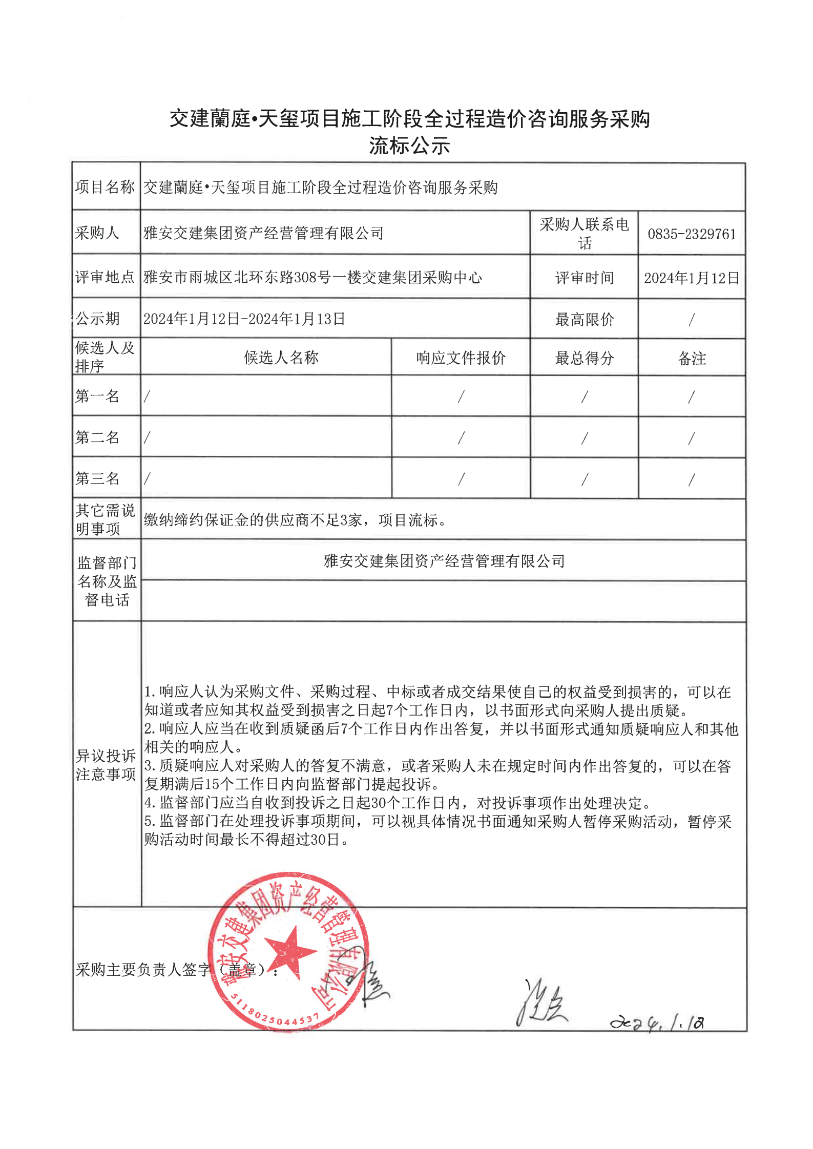 雅安交建集團資產(chǎn)經(jīng)營管理有限公司交建蘭庭·天璽項目施工階段全過程造價咨詢服務(wù)采購流標公示