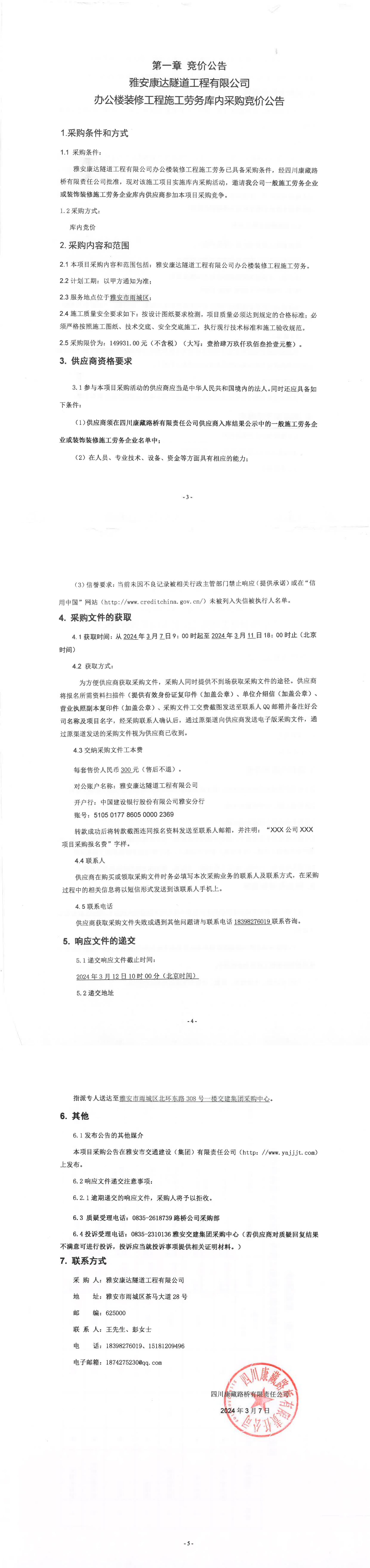 雅安康達隧道工程有限公司辦公樓裝修工程施工勞務(wù)庫內(nèi)采購競價公告