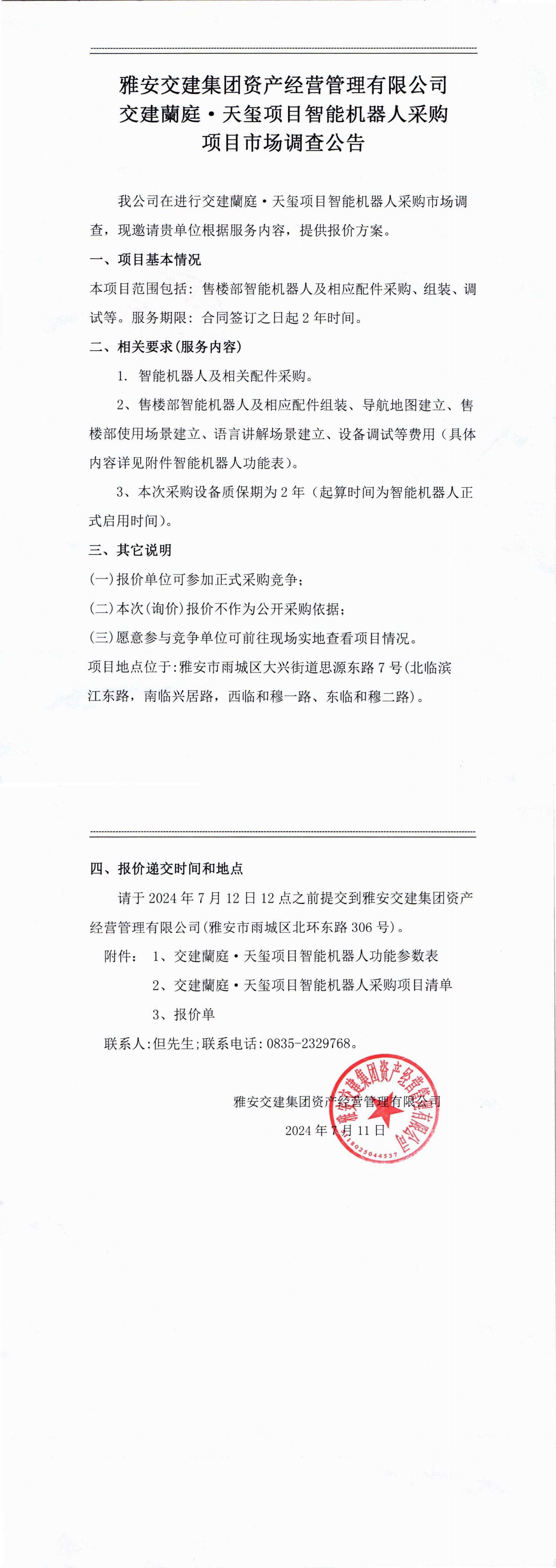 雅安交集團資產(chǎn)經(jīng)營管理有限公司交建蘭庭·天璽項目智能機器人采購項目市場調(diào)查公告
