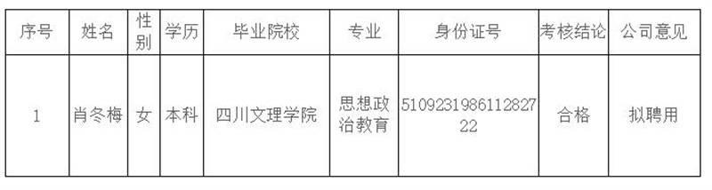 根據(jù)《雅安交建集團康居建設工程質量與室內環(huán)境污染檢測有限公司綜合考核聘用工作方案》,按照“公開、平等、競爭、擇優(yōu)”的原則,經(jīng)考核合格,現(xiàn)將我公司擬聘用人員名單予以公示。