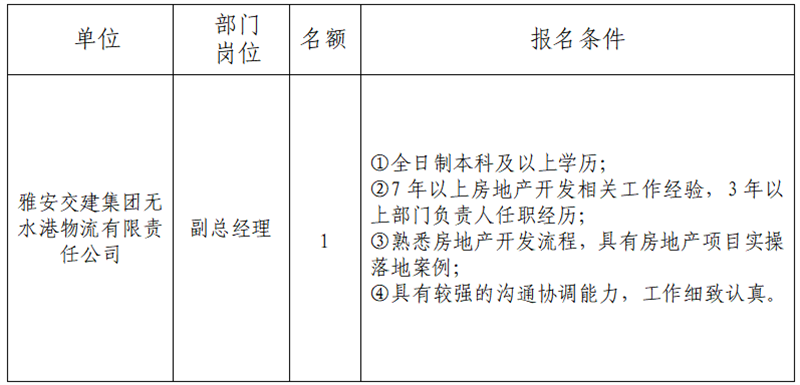 根據(jù)發(fā)展需要,現(xiàn)面向社會公開招聘雅安市交通建設(shè)(集團)有限責(zé)任公司(以下簡稱“雅安交建集團”)所屬子公司經(jīng)營班子人員1名,現(xiàn)將有關(guān)事項公告如下: