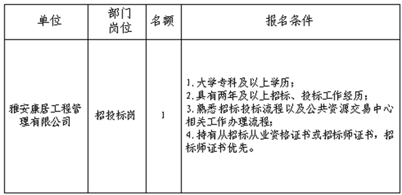 根據(jù)發(fā)展需要,決定面向社會公開招聘雅安市交通建設(集團)有限責任公司(以下簡稱“雅安交建集團”)所屬子公司工作人員1名,現(xiàn)將有關事項公告如下: