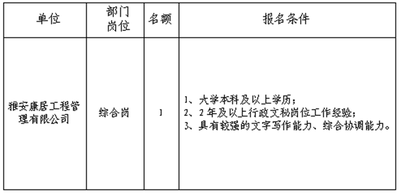 根據(jù)發(fā)展需要,決定面向社會公開招聘雅安市交通建設(集團)有限責任公司(以下簡稱“雅安交建集團”)所屬子公司工作人員1名,現(xiàn)將有關事項公告如下: