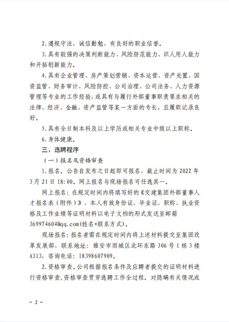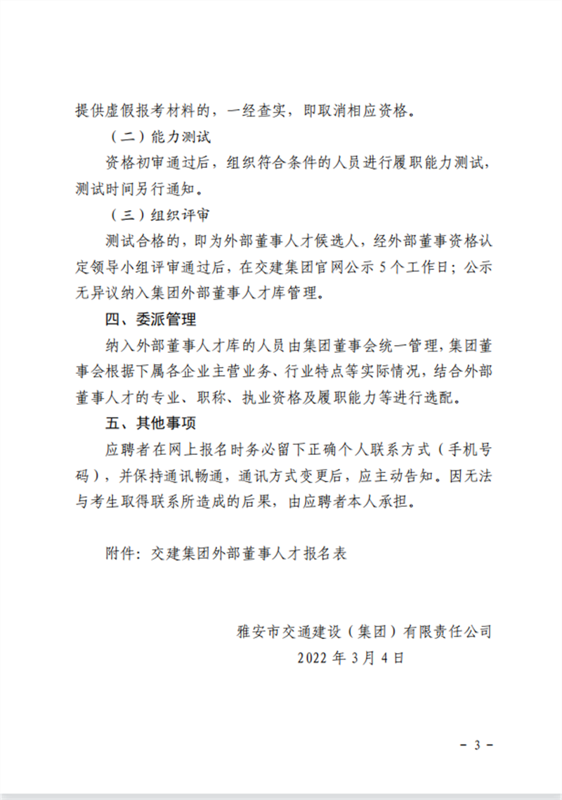 雅安交通建設(shè)(集團(tuán))有限責(zé)任公司 關(guān)于建立外部董事人才庫(kù)的公告