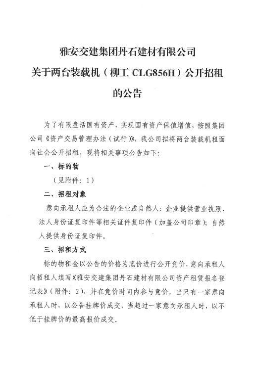 雅安交建集團丹石建材有限公司關于2臺裝載機公開招租的公告附件