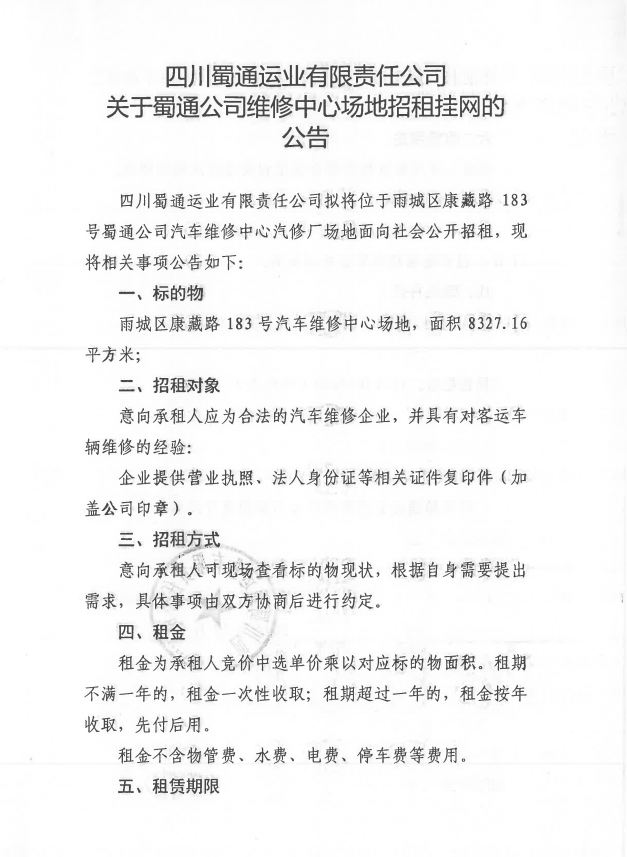 ËÄ´¨Êñͨß\(y¨´n)˜I(y¨¨)ÓÐÏÞØŸ(z¨¦)Èι«Ë¾ êP(gu¨¡n)ÓÚÊñͨ¹«Ë¾¾SÐÞÖÐÐĈö(ch¨£ng)µØÕÐ×â’ì¾W(w¨£ng)µÄ ¹«¸æ