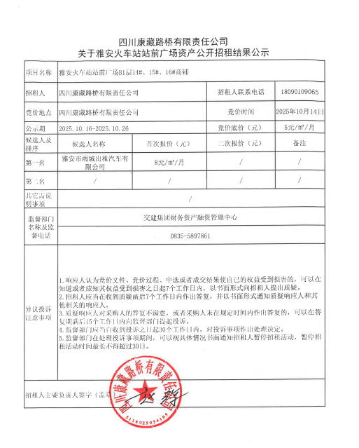 四川康藏路橋有限責(zé)任公司關(guān)于雅安火車站站前廣場(chǎng)資產(chǎn)公開(kāi)招租結(jié)果公示