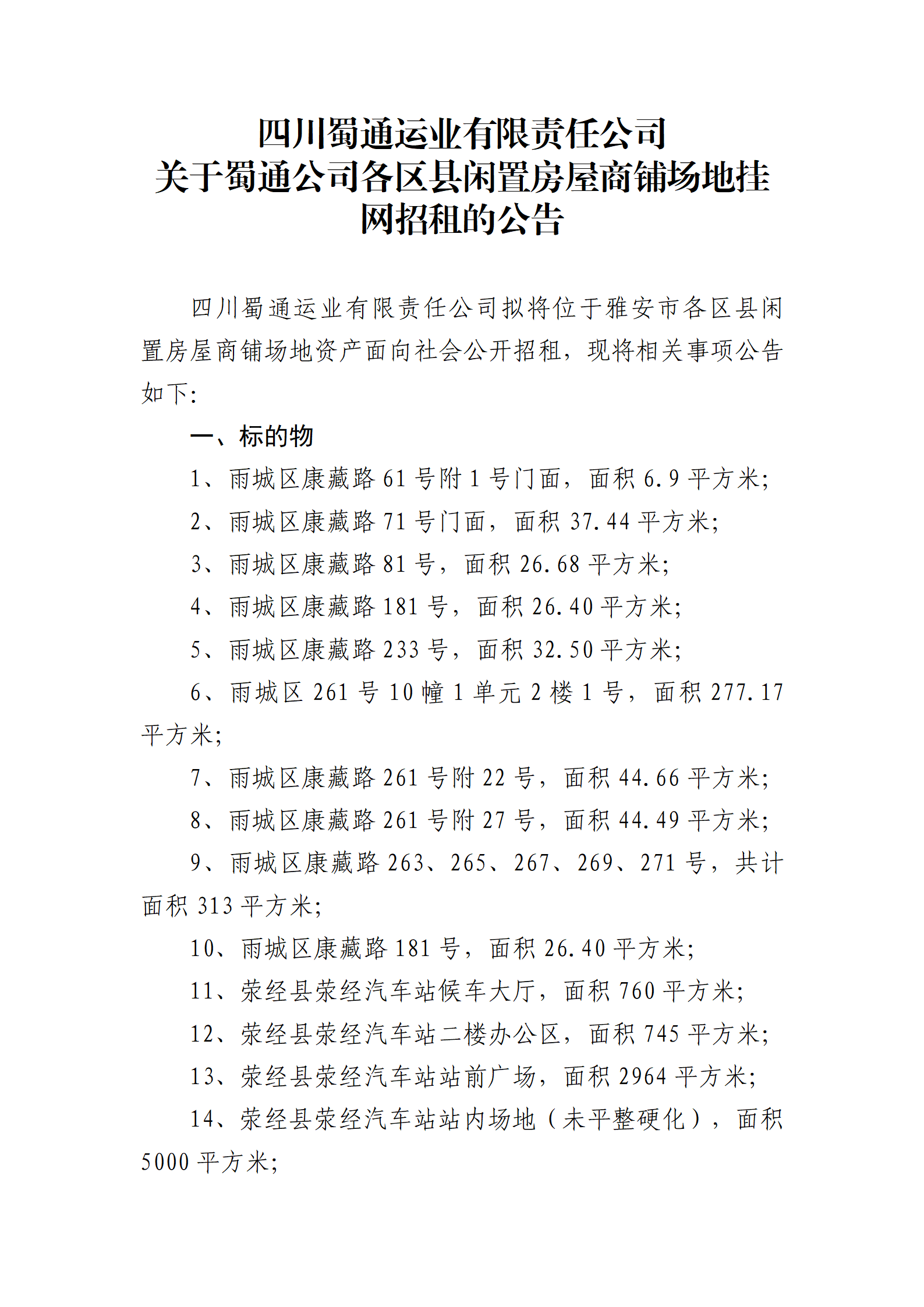 四川蜀通運業(yè)有限責任公司關于蜀通公司各區(qū)縣閑置房屋商鋪場地掛網招租的公告