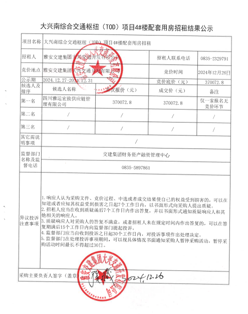 大興南綜合交通樞紐(TOD)項目4#樓配套用房招租結(jié)果公示