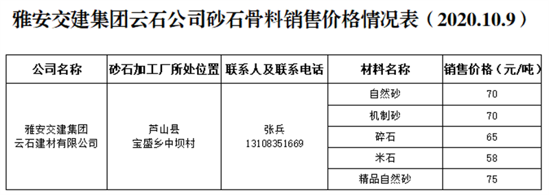 雅安交建集團云石公司砂石骨料銷售價格情況表(2020.10.9)