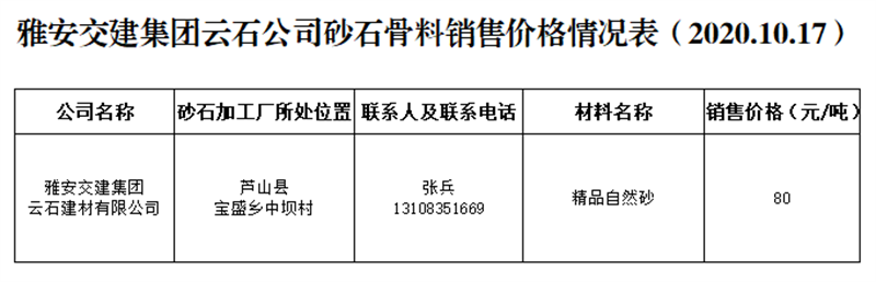 ÑŰ²½»½¨¼¯ˆFÔÆÊ¯¹«Ë¾É°Ê¯¹ÇÁÏäNÊÛƒr¸ñÇé›r±í£¨2020.10.17£©