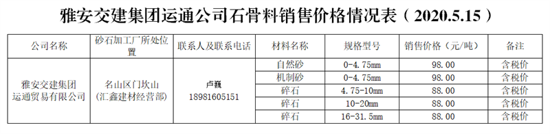 雅安交建集團(tuán)運(yùn)通公司砂石骨料銷售價格情況表(2020.5.15)