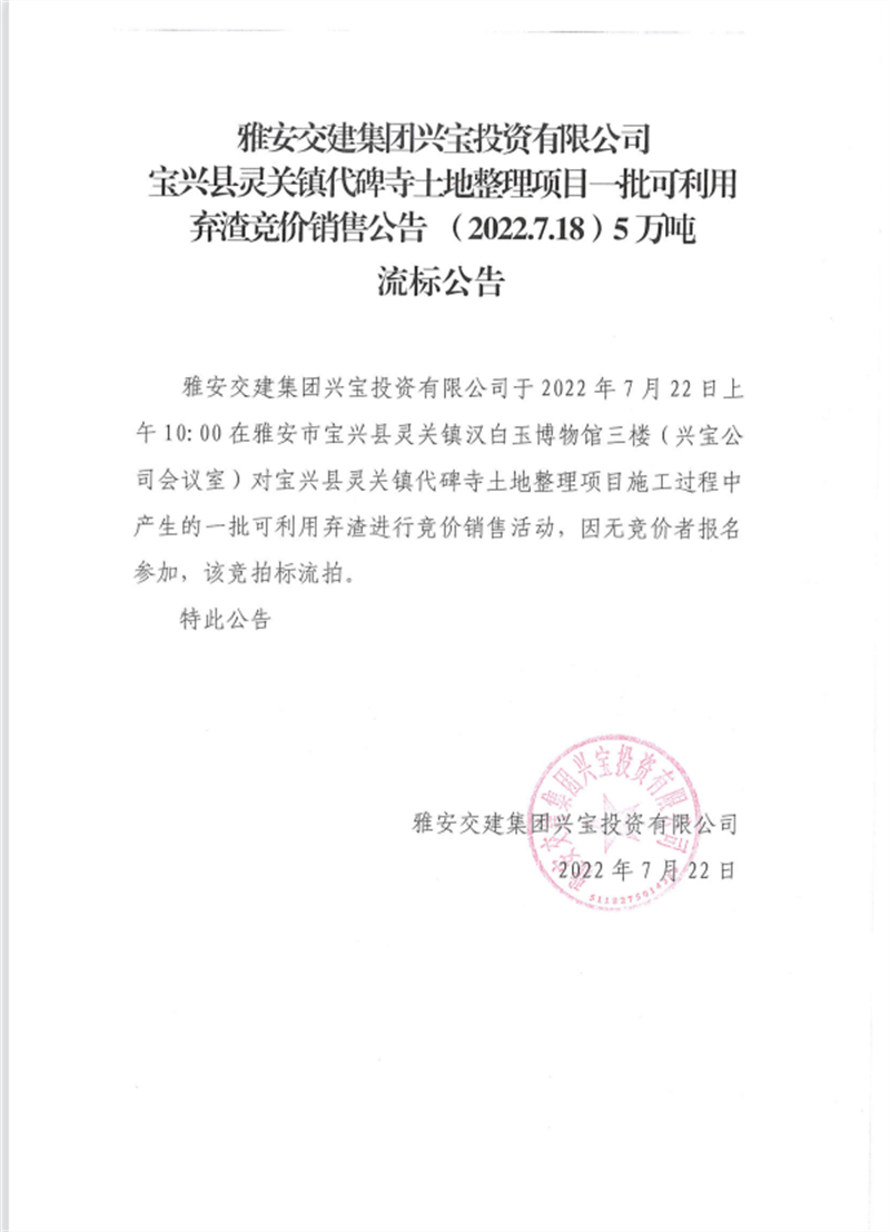 雅安交建集團云石建材有限公司成品料競價銷售公告