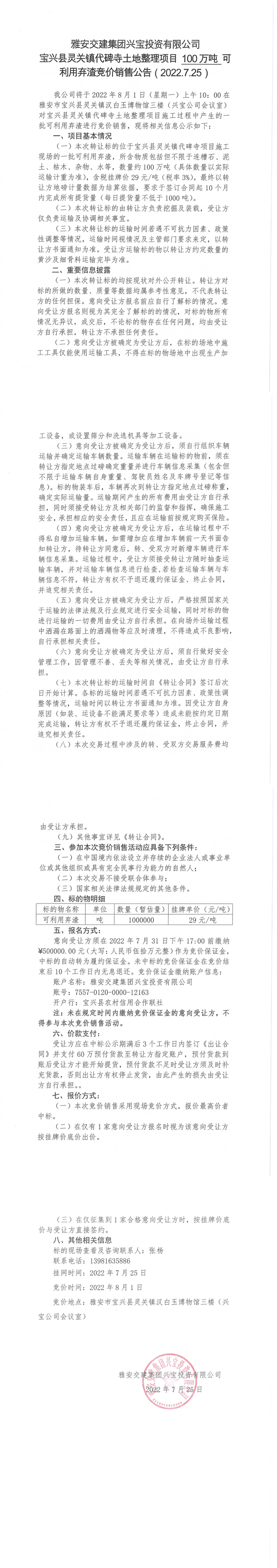 雅安交建集團(tuán)興寶投資有限公司寶興縣靈關(guān)鎮(zhèn)代碑寺土地整理項(xiàng)目100萬噸可利用棄渣競價銷售公告(2022.7.25)