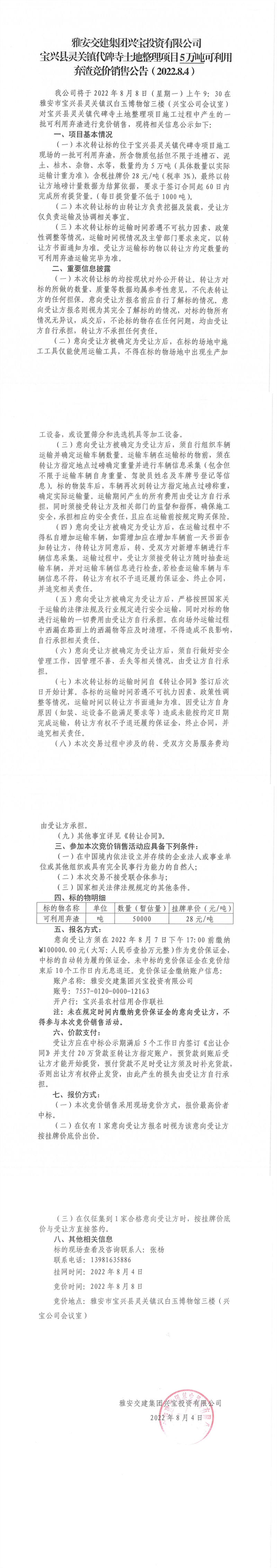 雅安交建集團(tuán)興寶投資有限公司靈關(guān)鎮(zhèn)代碑寺土地整理項(xiàng)目100萬噸可利用棄渣競價(jià)銷售公告(2022.8.1)