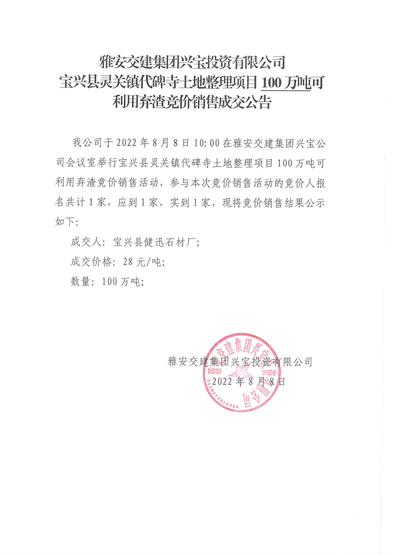 代碑寺土地整理項(xiàng)目100萬(wàn)噸可利用棄渣競(jìng)價(jià)銷售成交公告