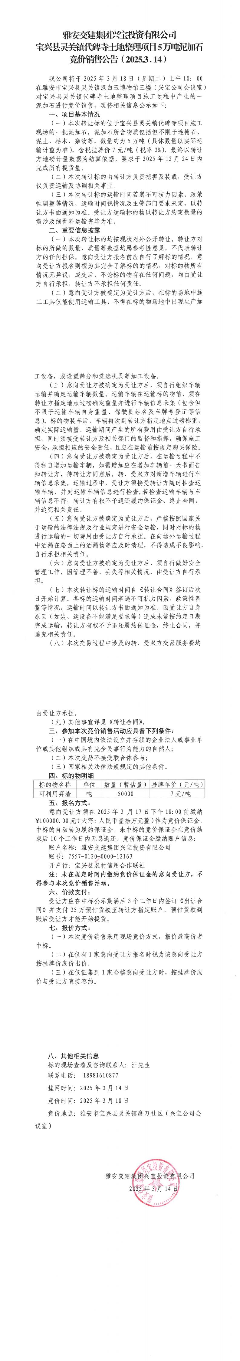 雅安交建集團(tuán)興寶投資有限公司寶興縣靈關(guān)鎮(zhèn)代碑寺土地整理項(xiàng)目5萬噸泥加石競價(jià)銷售公告(2025.03.14)